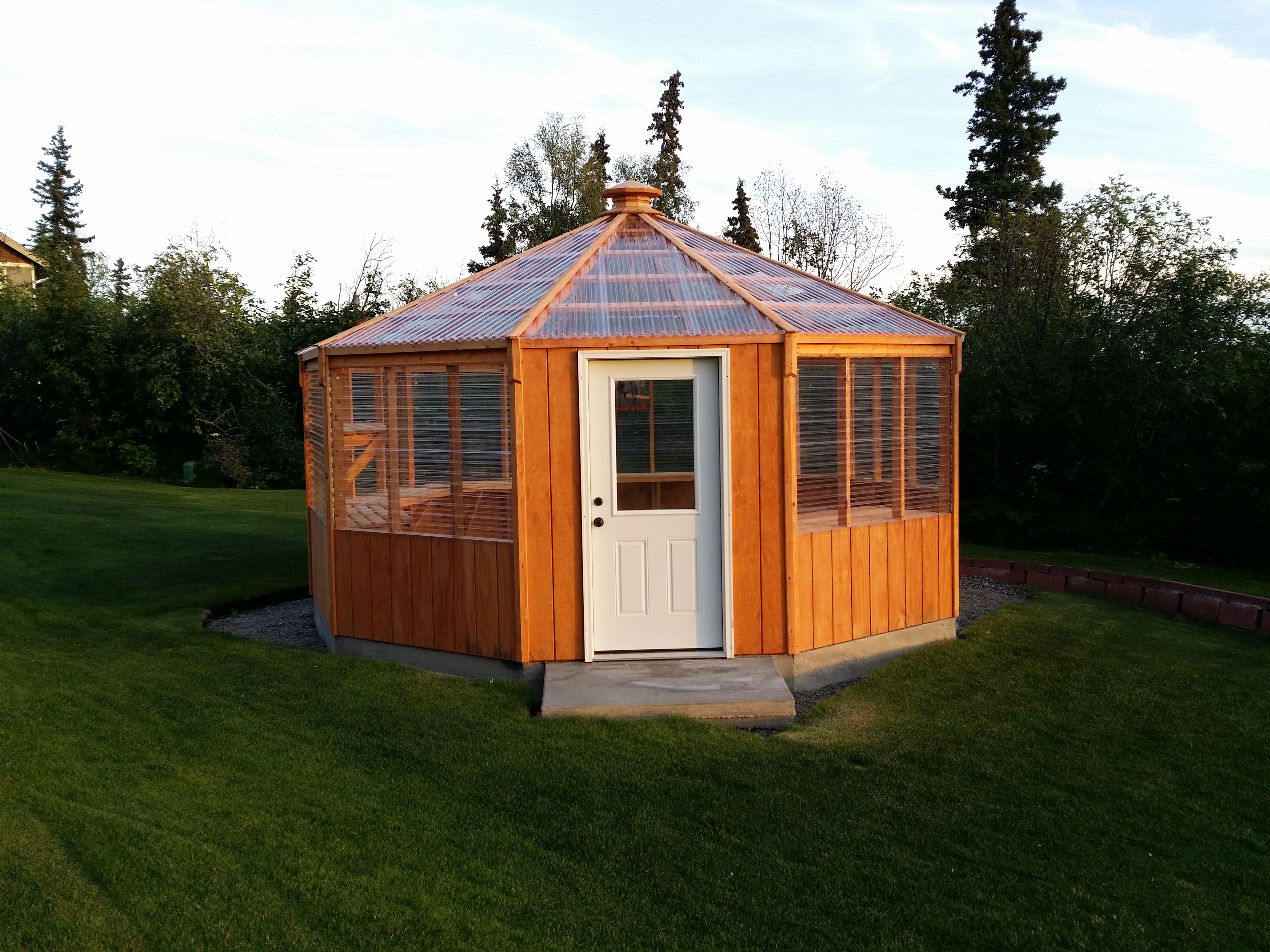 A sturdy, great looking, gazebo shaped greenhouse assembled onsite.