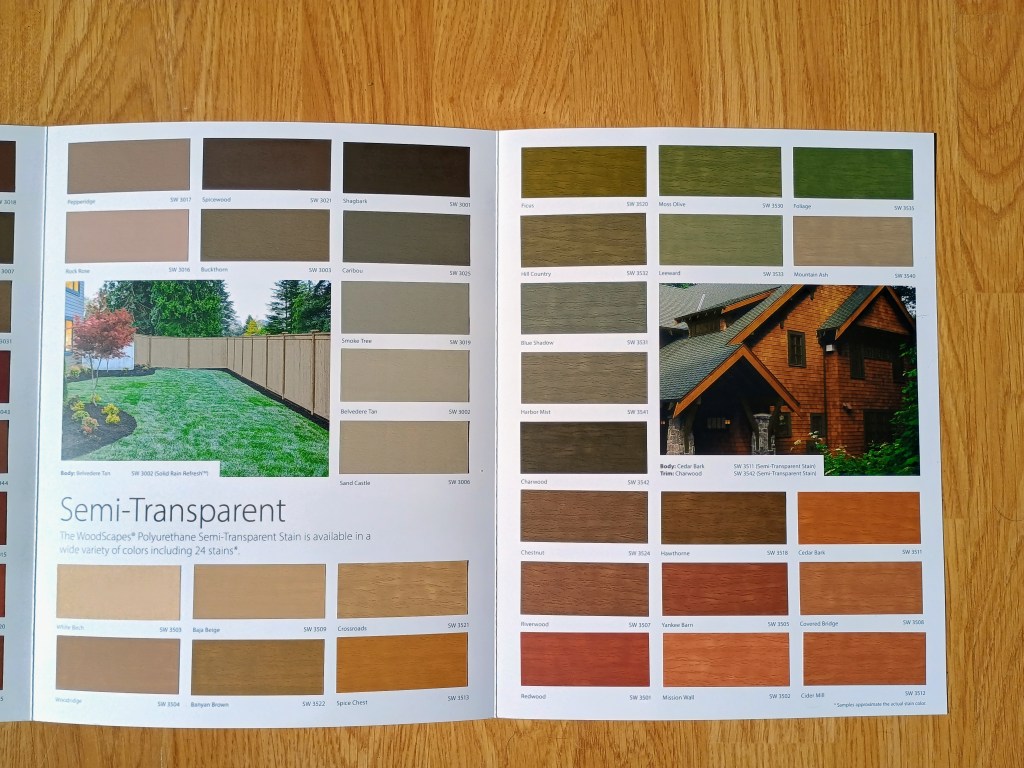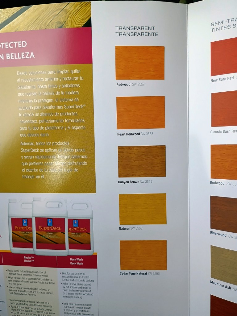 Pictured below are the Super Deck stains from their brochure and the Woodscape stains from their brochure.