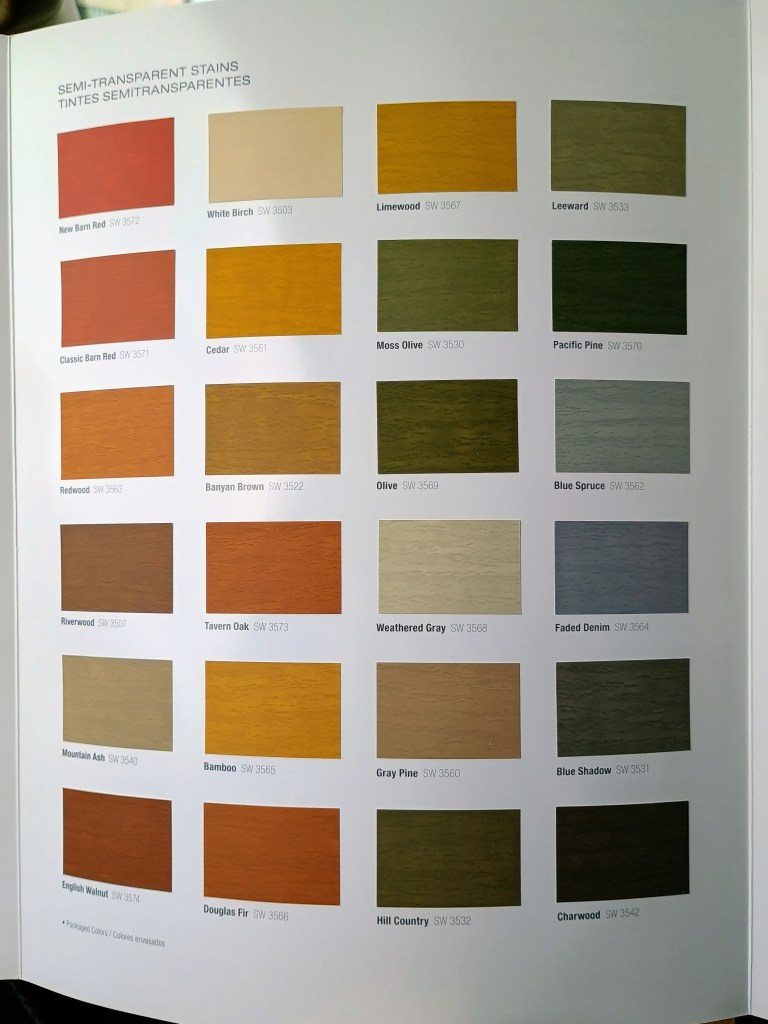 In the past most units were stained with semi transparent (Cedar Naturaltone) Behr, water based stain and then we would charge a fee for specifying a specific color instead. Now we are allowing the customer to select their specific stain colors, as well as a couple options on the doors and door handles. Sherwin Williams is offering free delivery to my shop and they offer Super Deck and Woodscape, but I can also get Preserva wood and Behr stains from Home Depot.